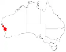 It is native to an area in the Wheatbelt and Mid West regions of Western Australia where it is commonly situated on low rises and sandplains growing in sandy soils.[1] It is found in coastal areas from around the Zuytdorp Cliffs in the north down to around Watheroo in the south extending to about 30 km (19 mi) inland as a part of low open woodland where it is usually associated with Banksia prionotes or in shrubland and heath communities.[2]