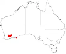 It is native to an area in the Wheatbelt and Goldfields-Esperance regions of Western Australia growing in sandy, clay or loamy granitic soils.[1] The shrub has a limited distribution extending from around Karlgarin in the west to around Lake Cronin in the east and to around Newdegate and Lake King where it is usually a part of Eucalyptus woodland communities.[2]