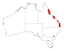 The tree is endemic to Queensland where it is often situated along the margins of rainforest in damper parts of the Atherton Tableland, the Eungella Range and the adjacent coast and in high rainfall areas between Maryborough and Brisbane. The tree is also found along river banks and in open Eucalyptus forest communities usually growing in sandy soils over granite.[2]