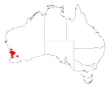 It is native to an area along the west coast in the Wheatbelt region of Western Australia between Dandaragan in the north to Mundaring in the south and Dowerin in the east. It is usually found on lateritic ridges and sandplains growing in sandy or gravelly soils[1] as a part of heathland communities.[2]