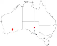 It is native to a small area in the Goldfields-Esperance region of Western Australia in a small area in the Dundas where it is found on low rocky hills growing in rocky sandy-loam-clay soils.[1] Only two populations of the shrub are known both of which are located about 25 km (16 mi) to the north of Norseman in mallee or shrubland communities.[2]