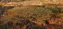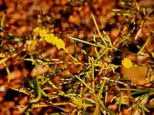 The low spreading, viscid shrub typically grows to a height of 0.2 to 1 metre (1 to 3 ft).[2] The obscurely ribbed branches normally spread horizontally giving the shrub a flat-topped appearance. The green to grey-green phyllodes are solitary or sometimes in clusters of two or three at the nodes. Each phyllode is 2 to 7 centimetres (0.8 to 2.8 in) in length and has a diameter of about 1 millimetre (0.04 in) and are straight or curve shallowly upward.[1] It blooms from March to October producing golden yellow flowers.[2] The simple inflorescences have an erect flower spike that is 10 to 45 mm (0.4 to 1.8 in) in length. Following flowering flat, thick and linear dark brown seed pods with a length of 2 to 8 cm (0.8 to 3.1 in) and a width of 2 to 6 mm (0.08 to 0.24 in). The erect and woody pods are sticky with resin and have an odour resembling like citronella or lemon grass. The ellipsoidal dull to slightly shiny brown seeds are 3 to 5.5 mm (0.12 to 0.22 in) long.[1]