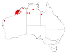 It is native to an area in the Kimberley region of Western Australia where it is commonly situated on undulating plains, rocky hills and ranges where it grows in red sandy or skeletal soils over quartzite or sandstone.[1] The bulk of the population is found in coastal areas of the west Kimberley from around the Dampier Peninsula, on the Buccaneer and Bonaparte Archipelagoes in the north down to around Thangoo Station in the south where it is usually part of in woodland and shrubland communities sometimes in seepage areas.[2]