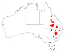 The shrub has a wide distribution through central New South Wales extending into Queensland. In New South Wales the bulk of the population is situated between Dubbo to around Gilgandra and Mendooran[2]