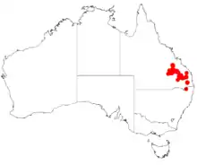 It is native to an area of Queensland from the Central Highlands Region on the Blackdown Tablelands in the north to around Toowoomba in the south east on the Darling Downs growing on sandstone ranges in shallow stony sandy soils as a part of open Eucalyptus woodland communities.[1]