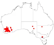 It is native to an area in the Great Southern, Wheatbelt and Goldfields-Esperance regions of Western Australia where it is commonly found on flats growing in a variety of soils.[1] The species is located from around Bencubbin in the north to around Nyabing in the south west and as far as Ravensthorpe in the east where it is found growing in loamy, clay, sandy loam, sand and sandy gravel soils as a part of mallee scrub.[2]