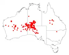 It is native to arid regions of Australia where it has a scattered distribution from Newman into southern parts of the Northern Territory and northern parts of South Australia. It is found on granite rises, rocky hills as well as flats and plains where it grows in red sand, loam or lateritic soils.[2] The range extends with isolated populations occurring in south-western Queensland.[3]