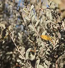 The spreading multi-stemmed tree or shrub typically grows to a height of 1 to 5 metres (3 to 16 ft)[2] and has a similar width. The branchlets have large resinous ribs with a blue-grey coloured resin coating new growth. The flat, green and straight to slightly curved phyllodes have a length of 5 to 30 mm (0.20 to 1.18 in) and a width of 2 to 4 mm (0.079 to 0.157 in) and have prominent nerves.[3] It flowers from May to August producing yellow flowers.[2] The simple inflorescences occur singly and are found in the axils. The flower-spike is 10 to 15 mm (0.39 to 0.59 in) in length. The flat, oblong, brown seed pods that form after flowering have a length of up to 3.5 cm (1.4 in) and a width of 11 to 15 mm (0.43 to 0.59 in) and have 1 to 2 mm (0.039 to 0.079 in) long wings. The oblong seeds within the pod are4 to 5 mm (0.16 to 0.20 in) long and half as wide with a small creamy aril.[3]