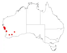 It is native to an area in the Mid West and Wheatbelt regions of Western Australia where it is found on sandplains and rocky hills growing in sandy and loamy lateritic soils.[1] It has a disjunct distribution with the bulk of the population situated from around Northampton in the north down to around Kalbarri in the south. with collections from near Moora and Lake Varley as a part of low shrubland communities composed of species of Acacia and Melaleuca.[2]