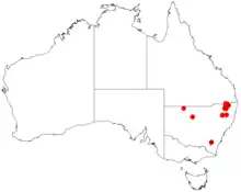 Velvet wattle grows on granite in dry sclerophyll forest near Emmaville and Torrington in New South Wales. In Queensland it grows in the Darling Downs district from Glen Aplin to Wallangarra.[2][4]