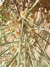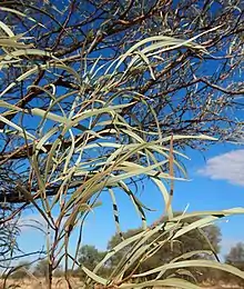 The gnarled shrub or tree typically grows to a height of 2 to 6 metres (7 to 20 ft)[3] but can be as tall as 10 m (33 ft) in Queensland. It usually has a single stem or few mains stems at the base from where it can regenerate after bushfires. It has thick spongy grey to back bark that fissures longitudinally and is spongy and yellow beneath. The brittle branchlets tend to break easily and are covered in fine silvery hairs but becoming glabrous with age. Like most species of Acacia it has phyllodes rather than true leaves. The silvery grey-green phyllodes are found in clumps at the end of the branchlets and have a long narrowly linear and strap-like appearance. They are flat with a length of 12 to 35 cm (4.7 to 13.8 in) and a width of 1 to 7 mm (0.039 to 0.276 in) and is somewhat rigid with a leathery texture. The spreading to erect phyllodes are straight or recurved and densely covered in fine silky hair when young but becoming sub-glabrous as they age with many parallel, fine longitudinal nerves that are equally prominent.[2]