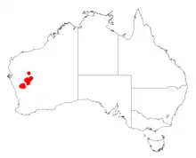 It is native to an area in the Mid West and Goldfields-Esperance regions of Western Australia where it is commonly situated on rocky rises or hills growing in rocky soils over or around granite, dolerite or basalt.[1] The range of the plant extends from around Meektharra in the north down to around Cue in the south with disjunct populations found further south near Yalgoo where it is usually a part of mulga scrub communities.[2]