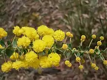 The shrub has an open to spindly habit and typically grows to a height of 1.5 to 2.5 m (4 ft 11 in to 8 ft 2 in). The dull grey-green phyllodes are flat or slightly twisted with an elliptic to broadly elliptic shape that can sometimes be broadly obovate. The phyllodes have a length of 17 to 45 mm (0.67 to 1.77 in) and a width of 10 to 23 mm (0.39 to 0.91 in).[2] The shrub blooms between September and November producing up to 20 inflorescences on axillary racemes along an axis of around 6 cm (2.4 in) in length. The spherical flower heads contain 14 to 23 pale yellow flowers. After flowering firm leathery brown seed pods form that are flat to curved with a length of 3 to 7 cm (1.2 to 2.8 in) and 12 to 21 mm (0.47 to 0.83 in).[1]