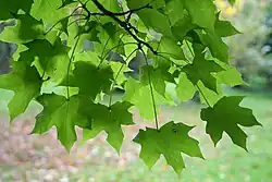 It is a small to medium-sized deciduous tree growing to 10–20 m tall, with a trunk 30–40 cm diameter with rough, grey-brown bark. The leaves are five-lobed (the basal pair of lobes usually small), 7–20 cm long and 12–20 cm broad, with a 5–15 cm long petiole; the petiole bleeds white latex if cut. The flowers are produced in spring at the same time as the leaves open, yellow-green, in erect corymbs. The fruit is a samara with two winged seeds aligned at 180°, each seed 8 mm wide, flat, with a 2 cm wing.[2][3]