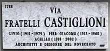 In 2014 the city of Milan named a street after the three Castiglioni brothers (Via Fratelli Castiglioni).[26]