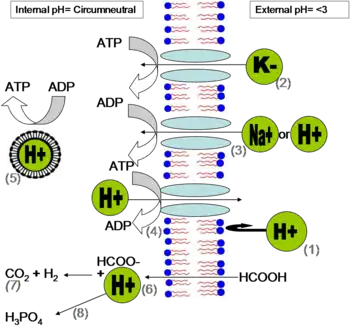 To grow at low pH, acidophiles must maintain a pH gradient of several pH units across the cellular membrane.[1] Acidophiles harness the strong proton motive force (PMF), caused by the pH gradient across their cell membrane, for ATP production. A large amount of energy is available to the acidophile through proton movement across the membrane, but with it comes cytoplasmic acidity.[1] Instead ions such as sodium can be used as a substitute energy transducer to avoid this pH increase (ATPases are often Na+ linked, rather than H+ linked).[20]