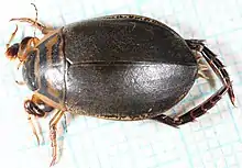 Color varies throughout the range of A. sulcatus and is not a good identifying characteristic; however, A. sulcatus shows many unique structural morphologies useful for identification. A. sulcatus is easily recognized by its large, distinctive hind legs. The hind legs are long and fringed with setae, forming a paddle-like shape when spread.[8] The body is always wider than the height of the insect, and is streamlined (no spines or other chitinous structures protruding). As in all Dytiscidae beetles, the sternal keel is absent. A. sulcatus is clumsy on land, but it is well adapted for an aquatic lifestyle and is a strong flier. A. sulcatus may also be recognized by its unique reproductive structures. Males have three ventral suction disks used to secure the male to the slippery female during reproduction.[9] Male attachment to females is detrimental to female survival as the mating period may attract predators. To avoid potential death in mating females show modifications of the elytra. The elytra is highly grooved with many suberect setae,[10] making male attachment far more difficult. The male elytra is smooth without setae showing high levels of sexual dimorphism. The competition between the sexes has led to an evolutionary sexual arms race.