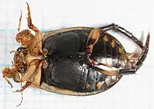 Aquatic beetles in the family Dytiscidae possess defensive glands used to secrete agents repellent and toxic to vertebrate predators.[11] Secretions primarily contain steroids synthesized from cholesterol.[12] The steroids secreted act to anesthetize predators, leading to narcosis. The steroids produced vary in levels of toxicity depending on food availability and photoperiod.[13] A. sulcatus is highly adapted for aquatic movement and can make effective use of its speed to escape threats. When tested against 72 other common water beetle species, A. sulcatus was shown to have the highest movement velocity.[14] During the day, A. sulcatus uses primarily visual information to avoid predators; however, in low-light conditions, chemical signals are used as the dominant cues for avoidance.[15]). It has also been suggested that a 'humming' sound, produced by an interaction of the wings and the elytra, is used as a defensive strategy by causing an unpleasant vibrating sensation in the mouth of a predator.[16]
