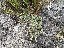 Actinotus bellidioides is a small rosette herb typically found in button grass moors, and other waterlogged habitats. The leaves are hairy and dark green, sometimes with toothed margins. The entire plant is usually about 3 cm (1.2 in) wide.[3]