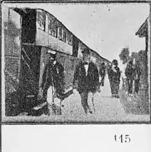Nicholas II of Russia and Empress Consort Alexandra Feodorovna visited France from 5 October to 9 October 1896, debarking in Cherbourg and traveling to Paris, where Méliès was making actualities. The two films he made of the visit, 48 and 50, were first shown on 12 October 1896 in the Théâtre Robert-Houdin.[15] This film presumably shows the imperial couple and their retinue on their way to Versailles.