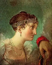 Described as a haughty grande dame and as an ancien regime royalist she is said to have cowed the emperor in to silence at times. Napoleon disliked her and called her "a little cripple, as stupid as she is ugly".[2] According to Laure Junot, she never actually enjoyed her position and had to be persuaded by Josephine to accept it.[3] It is noted that she preferred not to use her apartment her position entitled her to at the Imperial palace.[2]