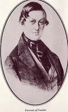 Custine, as an aristocratic general, and his son, an up-and-coming diplomat, seemed natural targets of suspicion. In 1792, after spending part of a year in Berlin, the younger Custine found himself under suspicion, despite his careful and circumspect behavior in Berlin: he had gone out of his way to make sure that he documented and reported any contact with the Prussians, and that all reports of his conversations were carefully and specifically annotated. He wrote to his mother-in-law that, by a miracle, he was not on the list of those to be arrested, and had avoided the September 1792 massacre at the Prison de l'Abbaye. He reported that he feared writing to his wife by the insecure post. He languished in Paris over the winter, but eventually he secured a position in his father's command in the Army of the Rhine, joining that army in Frankfurt. By August 1793, though, following his father's arrest, young Custine found himself proscribed, that is, on the list of suspected royalists.[39] The September Law of Suspects accelerated the son's trial. The chief evidence against him seemed to be a letter he had written to his father the previous spring, suggesting that he resign from the army, and this, as well as other lettersreal and forgedguaranteed his condemnation. He was condemned and guillotined a day later.[40] He left a young son, Astolphe-Louis-Léonor, Marquis de Custine (18 March 1790 – 25 September 1857).