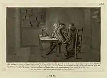 Upon arrival in Paris, Custine displayed his usual sang froid, which seemed to exasperate his political enemies. He took private rooms in a furnished hotel, and rented a room for his secretary. He visited his son and daughter-in-law, and carried on his usual Parisian social calendar: he appeared in all the public places, at the Palais-Royal and the theater, and was received with noisy ovations and shouts of Vive Custine! The Committee of Public Safety ordered a policeman to accompany him everywhere. On 22 July, he was arrested and imprisoned in the Luxembourg. On 23 July, the news came that Mainz had capitulated; on 28 July came the news of the loss of Valenciennes. He was transferred to the Conciergerie on 28 July, and his rooms, those of his secretary, and those of his son were sealed, pending a search.[13]