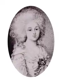 Born in Metz on 4 February 1740, Custine was a son of Philippe-François-Joseph, comte de Custine,[28] and Anne-Marguerite Maguin, daughter of Francois, comte d' Roussy and Marguerite de Walter.[29] His father, the tenth count, had died at the Battle of Rossbach in 1757, one of six French generals killed in the engagement.[30] Custine's other titles included Signeur de Guermagne and de Sareck, and he was, after 1770, also the lord of Niderviller, a property he purchased.[31] He married Adelaide-Celeste Louise Gagnat de Longny.[32] In 1790 Custine's daughter, Adelaide-Anne-Philippe, married Henri Evrard, marquis de Dreux-Brézé,[33] master of ceremonies for Louis XVI. She and her husband spent much of the early 1790s as refugees in Britain, although he returned to France several times to visit his estates;[34] he was eventually confirmed as a peer of France,[31] resumed his pre-Revolution position as master of ceremonies, this time for Louis XVIII, and was awarded military rank.[35]