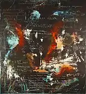 He will frequently work on a painting for an entire day, later to completely scrape off all the paint that was applied, leaving only remnants of the paint that found its way into previously gouged out areas. He works like this over the course of years to build a single painting, with its layers mostly never seen by the viewer though they impart a sense of history. Throughout the process the use of language — written, painted, or scraped into the paint — is actively employed, expressing poetic, philosophical and personal messages, most of which get covered over or remain as fragmentary relics.