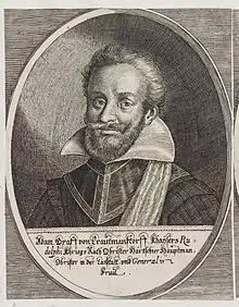 Adam von Trautmannsdorf (1579–1617), kaiserlicher Kämmerer und oberster Kriegsrat, general of the Croatian and Austrian Littoral. Commander in chief of the Archduke in Friuli during the Uskok War. He arrived in Gorizia on 27 December 1615 and ordered his headquarters at Rubbia Castle where he died, shot while visiting the trenches, on 7 June 1617.[1]