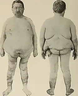 Adiposis dolorosa of the diffuse truncal form (Dercum). The anterior view shows the peculiar apron of fat and the small size of the hands. The posterior view shows the arrangement of fat in folds over the hips.