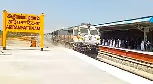 Adirampattinam railway station (station code: AMM) is a railway station serving the town of Adirampattinam in Tamil Nadu, India. The station is a part of the Tiruchirappalli railway division of the Southern Railway Zone and connects the town to various parts of the state as well as the rest of the country.