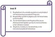 The position of international law as a source of law in Mongolia was elevated following the 1992 Constitution of Mongolia.[6] According to Art 10(3) of the Constitution, international treaties to which Mongolia is a party eventually becomes domestic law, unless they contradict the Constitution itself.[4]