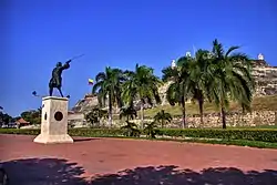 He was later honoured for his part in the siege of Cartagena de Indias; a square and an avenue in the modern city of Cartagena are named after him. A modern statue stands in front of the Castillo San Felipe de Barajas. In 2011, during a conference on Blas de Lezo's place in history and honouring the 270th anniversary of Cartagena de Indias' defence, a plaque was placed on the wall at the Plaza de los Coches, by the Clock Tower portal.[15] In November 2014, a 35,000 kilo statue of de Lezo was erected in Madrid's Plaza Colón.[16]