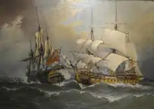 A 19th-century depiction of Blas de Lezo's frigate towing its prize, the Stanhope (ca. 1710)