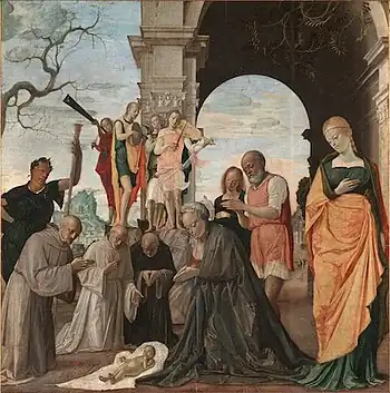 The Adoration of the Kings is a small oil painting on panel of c. 1500 by Bramantino in the National Gallery, London.[1] In it the Holy Family and the Magi are, unusually, joined by an adult John the Baptist, whose Baptism of Christ was celebrated on the same day as Epiphany in the liturgical calendar. At 56.8 cm (22.4 in) × 55 cm (22 in), it was probably commissioned for private use by an individual rather than for placing in a church, but nothing is known about its early history.[2] The panel entered the National Gallery in 1916 as part of the Layard Bequest.[3]