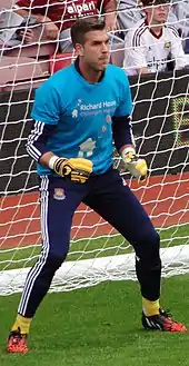 On 11 January 2014, Adrián kept his first Premier League clean sheet, in the 2–0 away win over Cardiff City.[21] On 6 May, he attended the club's awards and won "Save of the Season" for a fingertip save from Oscar against Chelsea in January. He also won "Best Individual Performance" for the same match, in which he kept a clean sheet in a goalless draw, as well as "Signing of the Season". He was also named runner-up "Hammer of the Year" to Mark Noble.[22] By the end of the 2013–14 season, he had become West Ham's first-choice goalkeeper, replacing previous incumbent Jussi Jääskeläinen.[23] In an FA Cup third-round replay penalty shoot-out against Everton on 13 January 2015, Adrián saved from Steven Naismith. The shootout went to sudden death, in which he scored the winner after his Everton counterpart, compatriot Joel Robles, struck the crossbar.[24] Despite having never taken a competitive penalty before, he was so confident he would score and win the match that he removed his goalkeeping gloves before taking it – his team won it 9–8.[25]