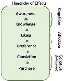 Lavidge et al.'s Hierarchy of Effects: Awareness→ Knowledge→ Liking→ Preference→ Conviction→ Purchase[54]