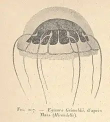 Aeginura grimaldii is a species of deep sea hydrozoan of the family Aeginidae.[1] It is found in the north-eastern Atlantic Ocean, Pacific Ocean, and the Arctic Ocean. It has a depth range of 660-1200m deep. Live specimens are bright reddish in color, with pale tentacles, and a light red globous capsule dome containing the dark colored red body. It usually measures no more than 4.5cm from the peak of the bell to the end of the tentacles.