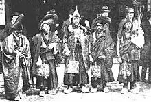 A production company Explorers' Films, with Younghusband as chairman, had been set up to make the film.[24] Because there was no film footage high on the mountain and it was not known if the summit had been reached, Noel planned a total theatrical experience. The stage setting was a Tibetan courtyard with shimmering Himalayan peaks painted on the backdrop. To provide what Noel called "large doses of local colour", before the film started a group of monks was to come on stage equipped with ethnic accoutrements to perform pseudo-religious music, chanting and dance.[25][note 3] The headline in the Daily Sketch "High Dignitaries of Tibetan Church Reach London; Bishop to dance on Stage; Music from Skulls" was not couched in terms that the Tibetan authorities would wish for. The performers were genuinely monks (despite the publicity proclaiming "seven lamas", there was in reality only one) but they were from nowhere near Mount Everest and they had been inveigled out of Tibet without permission from their superior.[25][27] To the satisfaction of the press when the monks went to the London Zoo they were shown the llamas.[28] To begin with the show was a critical and public success. It toured Britain and Germany and over a million people in the United States and Canada went to see it.[25] However, the political difficulties turned things sour and by the end of 1925 Explorers' Films had gone bankrupt in Colombo, requiring the Mount Everest Committee to send £150 to get the monks back to India.[29] Only a few of them returned to Tibet and those who did were severely punished.[30]