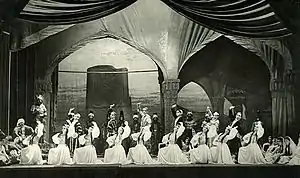 Badalbeyli's career in music began in 1928 when he composed music for Jafar Jabbarly's staged play Od Galini. He is particularly famous for being the author of the first Azerbaijani ballet, entitled Giz Galasi (The Maiden Tower), which he composed in 1940. The ballet was dedicated to Gamar Almaszadeh.[8] His later works included Khalg Gazabi ("The Popular Rage", 1941; co-author Boris Zeidman), Nizami (1948) and Soyudlar aghlamaz ("Willows Don't Cry", 1971). He wrote librettos for the Azerbaijani opera Bahadir va Sona and the ballets Giz Galasi, Garaja Giz ("Nigella") and Gizil Achar ("The Golden Key"). He composed background music for theatrical plays and being the only libretto translator of the time did equirhythmic Azeri translations of the librettos of the operas by Pyotr Tchaikovsky, Gioacchino Rossini, Armen Tigranyan and Zakaria Paliashvili. Throughout the 1950s and the 1960s he published several books on the history and development of classical music in Azerbaijan, namely: Discussions on Music, Gurban Pirimov, Musical Dictionary, and The Azerbaijan State Opera and Ballet Theatre.[7] In 1960, he was awarded the title of the People's Artiste of the Azerbaijan SSR. He remained a conductor at the Opera and Ballet Theatre till his death in 1976.