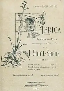 Battling his severe depression, Saint-Saëns sought solace in his favorite retreats, Egypt and Algeria. It was during this time that he found inspiration for Africa, a fantasia which draws heavily from North African influences.[1] Saint-Saëns began the composition in March 1891 while he was in Cairo and completed it within a month, though continuing working on the orchestration in Algiers in June.[3] The score was first published in Paris by his longtime publisher Auguste Durand: in October 1891, an arrangement for two pianos was the first to be published, orchestral parts were prepared in November, the piano solo version was completed in December, and the orchestral score appeared in February 1892.[4] In a letter to Durand, Saint-Saëns described the work as a derivative of the Suite algérienne, Op. 60, and expressed his hope that it might overshadow his Rhapsodie d'Auvergne, Op. 73, as it was "more developed".[5]