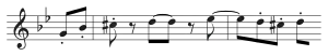Theme F is a complex motif primarily consisting of triplet sixteenth notes in G major, alluding to a "swarm of drunken wasps". Theme F also serves to prepare the assertive theme G.[8]