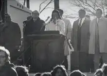 Coretta Scott King was the wife of Martin Luther King Jr. She was famous during the civil rights movement and not simply because she was the spouse of Martin Luther King Jr. She was known for her singing ability and promoted her husband's civil rights efforts and raised money for the cause.[6] King was a devout Christian; her husband was the co-pastor of the Ebenezer Baptist Church. Her husband founded the Southern Christian Leadership Conference and she was appointed as the frontwoman of the organization. In her memoir, King notes her role in helping and supporting her husband's profession of ecclesiastical leadership. She assisted in writing sermons and embraced, for the most part, the private practices of her husband, including a dedication to limit materialism in their lives.[7]