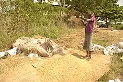 winnowing of threshed rice separates the stock from the paddy rice, by a Nigerian woman