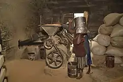Women working in the mill. The husk and bran of the parboiled rice are removed to give the white grain in south east Nigeria.