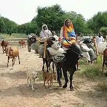 Transhumant groups own most of the Nilotic variety of cattle, and their migrations, related to the wet and dry seasons, usually do not exceed 150-160 kilometers.[16] The majority of Baqqara cattle belong to the Baqqara Arabs, who were once largely nomadic, but since at least the early 1900s usually maintained a settled base in which to cultivate crops.[16] The farmers, their relatives, or their agents move the cattle over traditional migratory routes northward during the rainy season and southward to the area of the Bahr al-Arab as the dry season progresses.[16] Migrations in either direction might amount to 400 kilometers.[16]