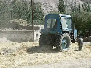 Up to 1991, agriculture in Tajikistan (then Tajik SSR), as in all other Soviet republics, was organized in a dual system, in which large-scale collective and state farms coexisted in a symbiotic relationship with quasi-private individual farming on subsidiary household plots. The process of transition to a market economy that began in independent Tajikistan after 1992 led to the creation of a new category of midsized peasant farms, known as dehkan farms (Tajik: хоҷагиҳои деҳқонӣ (фермерӣ), Russian: дехканские (фермерские) хозяйства), between the small household plots and the large farm enterprises. As of 2006, around 25,000 peasant farms control 60% of arable land, or 530,000 hectares (the remaining 40% is split evenly between household plots and farm enterprises).[6] The efficiency of peasant farms, however, is relatively low, as they accounted for only 34% of the value of crop production in 2006, while household plots with less than 20% of arable land produced 45% of the value of all crops. Still, peasant farms harvested 50% of all cereals and nearly 60% of cotton in 2006. Household plots are an undisputed dominant force in the livestock sector, with 89% of cattle and 94% of cows. They accordingly accounted for 90% of the value of livestock production in 2006. The large farm enterprises that dominated agriculture during the Soviet period are of marginal importance today.