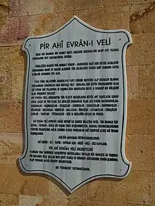 Sheikh Pir Nasiruddin Abul Hakayik Pir Mahmud bin Ahmed Ahi Evran bin Abbas Veli al-Khoyi (1169–1261), commonly known as Ahi Evran or Pir Ahi Evren-ı Veli, was a Turkic Alevi Sufi saint, preacher, philosopher, poet who wrote 20 books. He is mostly remembered as the founder and leader of the Ahi Brotherhood.[1]