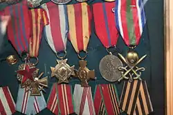 Photo of Ahmadiyya Jabrayilov with his French medals (including Médaille militaire, Croix de Guerre, Medal for the War Wounded, Combatant's Cross and Croix des services militaires volontaires)